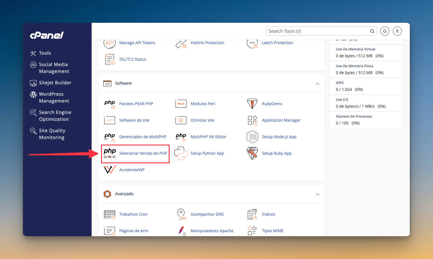 A versão PHP da sua conta de hospedagem pode ser alterada a qualquer momento em seu painel de controle. Para fazer isso, acesse seu cPanel e clique na opção Selecionar Versão do PHP, localizada na seção Software:
