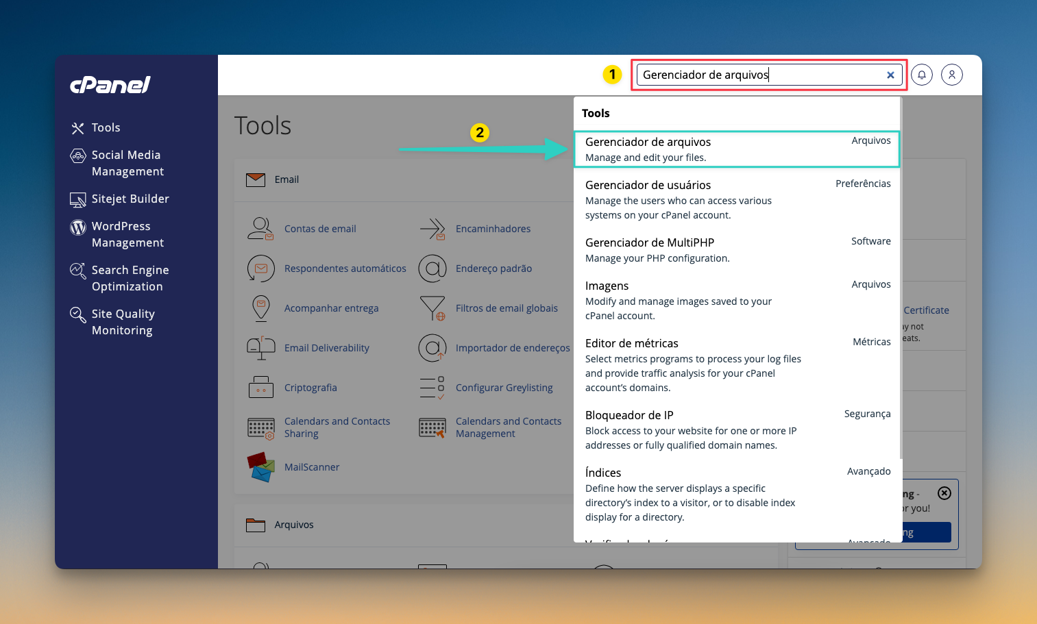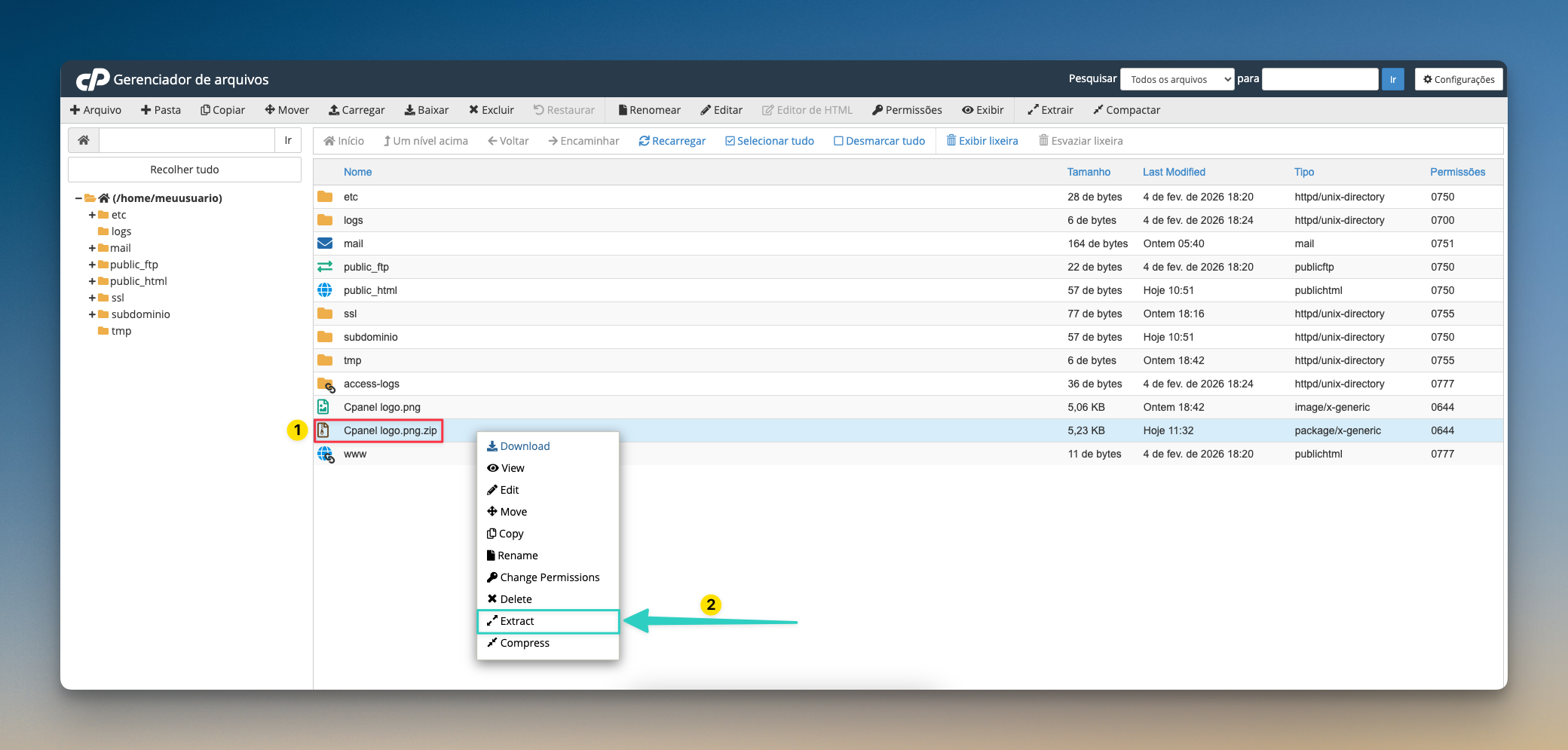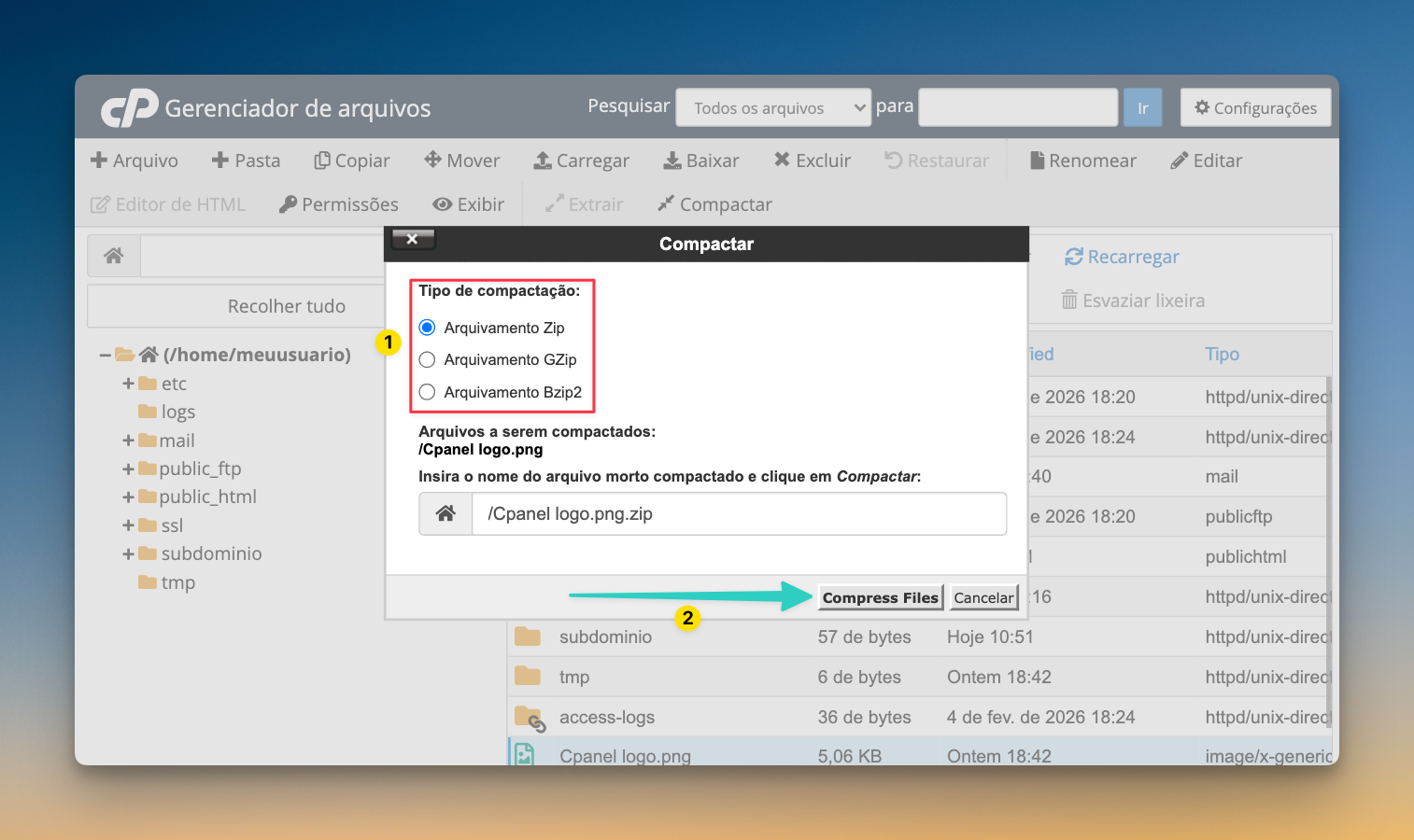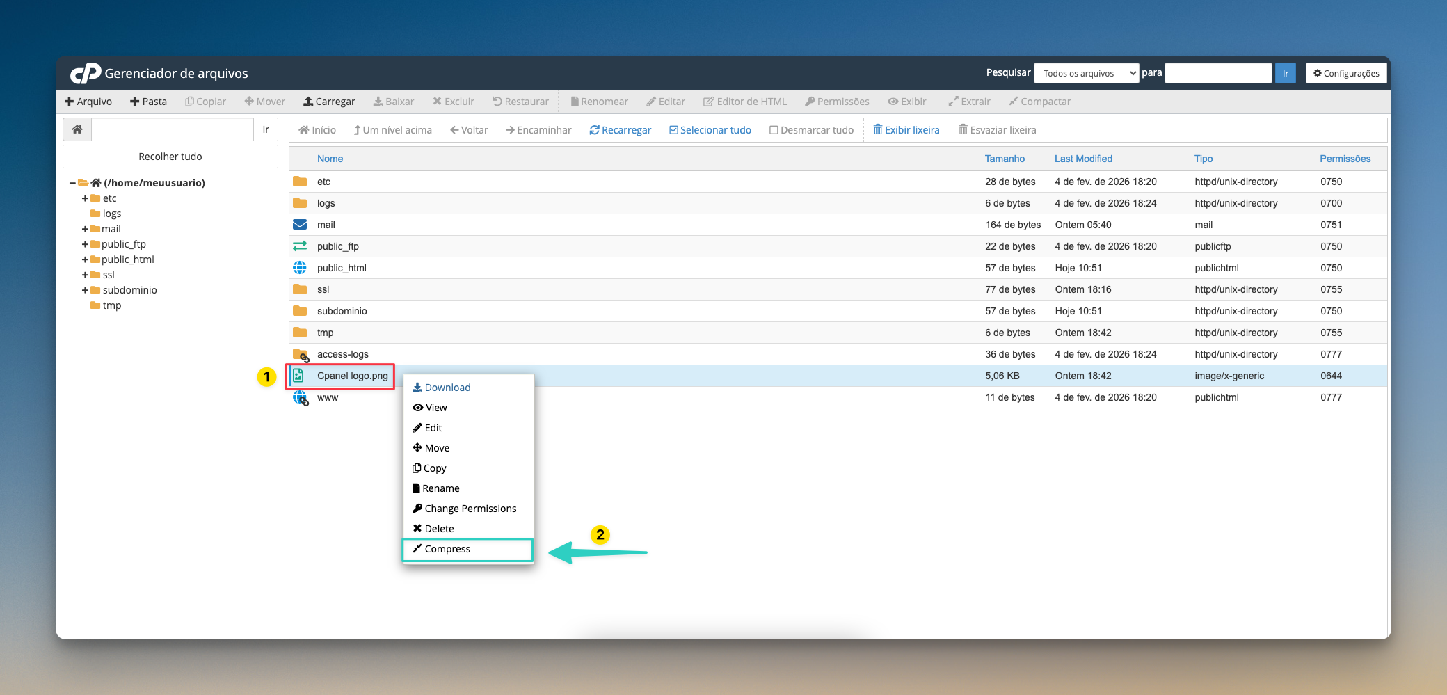 Para realizar uma compactação de arquivos no cPanel você pode seguir os seguintes passos:
