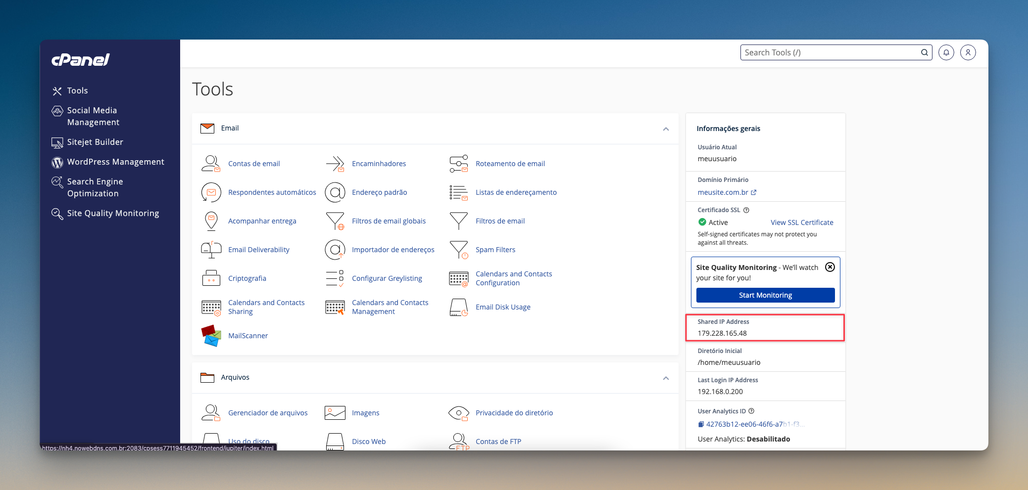 Para verificar seu registro A atual, acesse sua conta cPanel e verifique a seção à direita do painel: